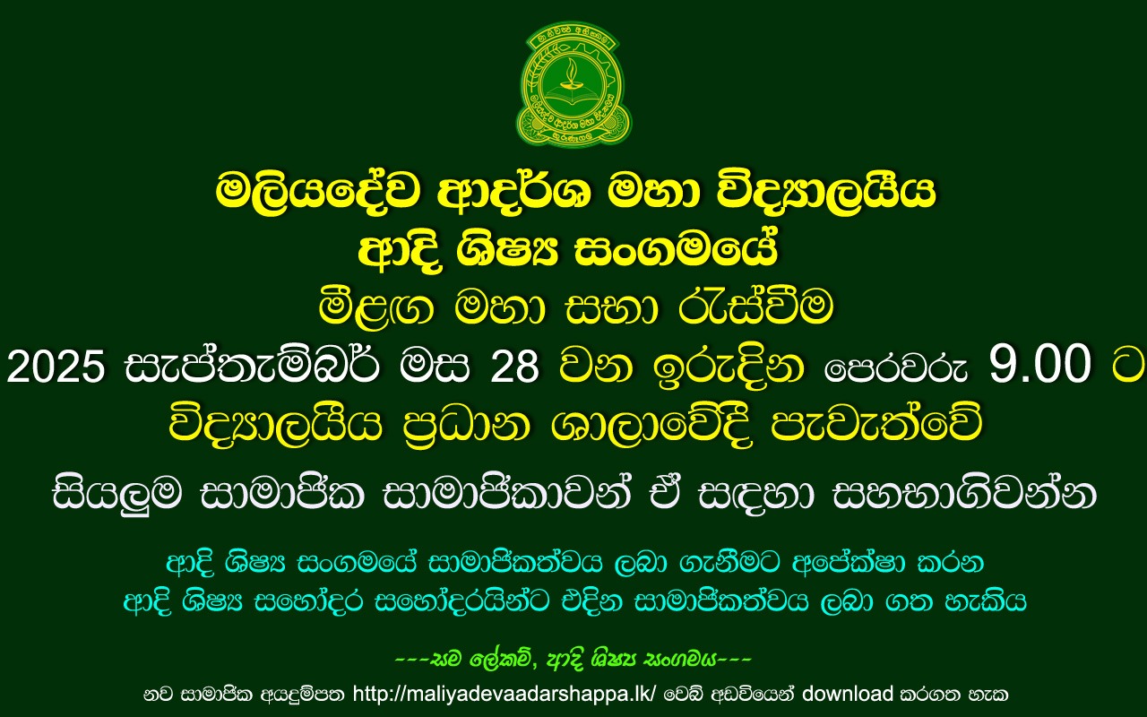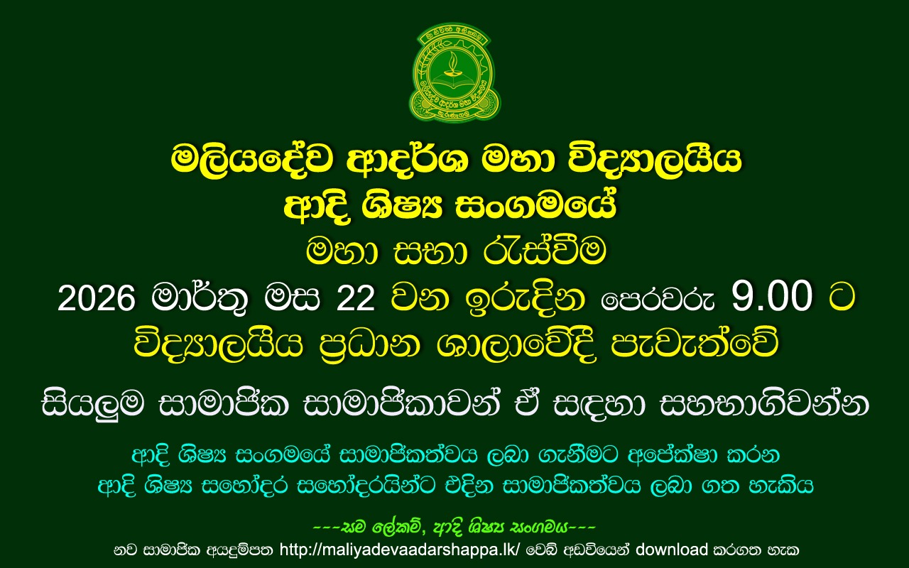 The Maliyadeva Adarsha Past Pupils’ Association (PPA) was established in 1995, with its operations officially commencing in 1996. The association was formed with the aim of fostering unity among alumni and contributing meaningfully to the development of the alma mater, Maliyadeva Adarsha Maha Vidyalaya, Kurunegala.